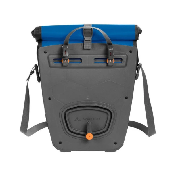 La paire de sacoches de voyage Vaude Aqua Back vous suivra dans tous vos déplacements à vélo quel que soit le temps. Ces sacoches arrière imperméables ont été fabriquées en Allemagne avec un matériau de bâche durable, sans PVC. Leur fermeture par roulement permet d’adapter la taille du sac, d’une capacité maximale de 24 litres, au contenant et de garder ce dernier au sec. Une poche intérieure supplémentaire permet de ranger facilement les objets séparément. Les Aqua Back Color se fixent aisément et solidement au porte-bagages arrière grâce au système QMR 2.0. Avec un cadenas de vélo, elles peuvent être verrouillées directement sur le crochet QMR. Pour votre sécurité, elles sont dotées d’éléments réfléchissants.