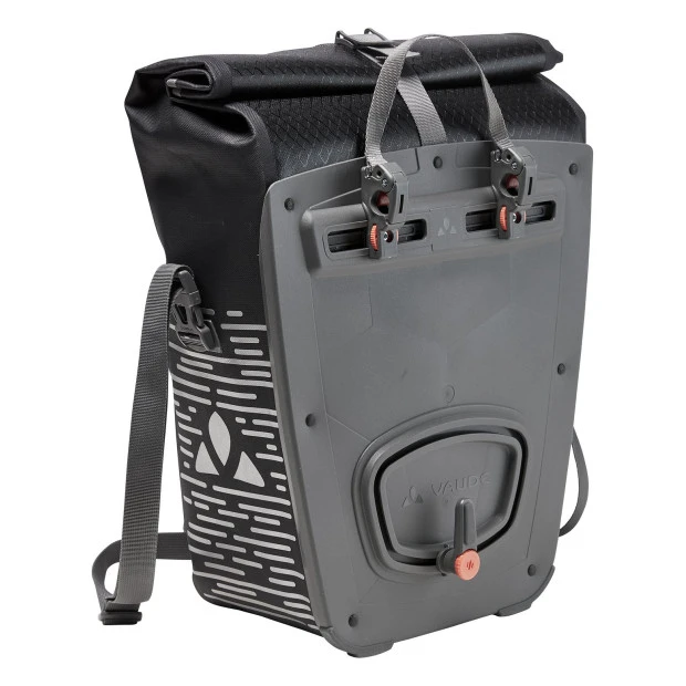 L’Aqua Back Luminum Single II est également équipée du système de fixation QMR 2.0 et d’une plaque dorsale stable pour l’installer sur votre porte-bagages arrière. Il suffit de tirer sur la bande reliant les deux crochets pour ouvrir aisément le système. Celui-ci est verrouillable à l’aide d’un petit cadenas (vendu séparément). Une bandoulière pratique facilite le transport à pied.