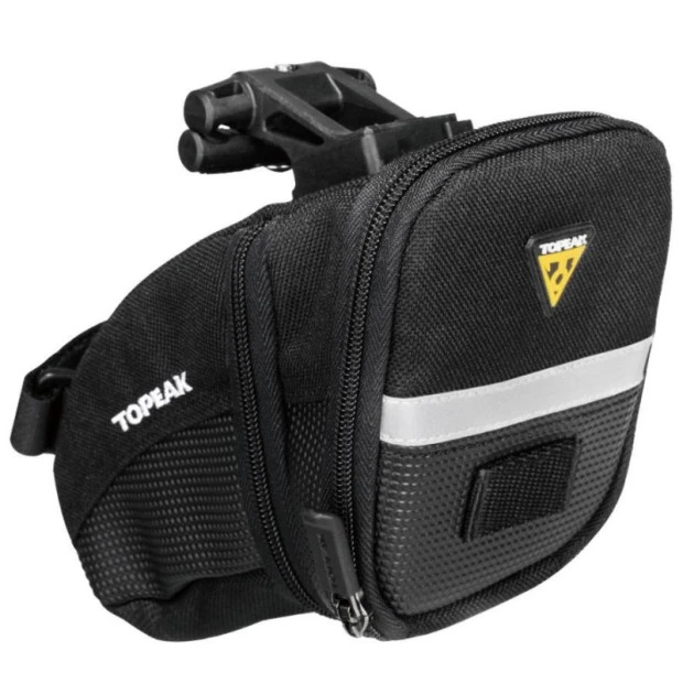 La sacoche de selle Topeak Aero Wedge vous permettra d’emporter avec vous tout le nécessaire aux menues réparations de votre vélo (outil multifonction, chambre à air, cartouche de CO2, etc.). Elle se fixe et s’enlève rapidement grâce au système de fixation QuickClick.