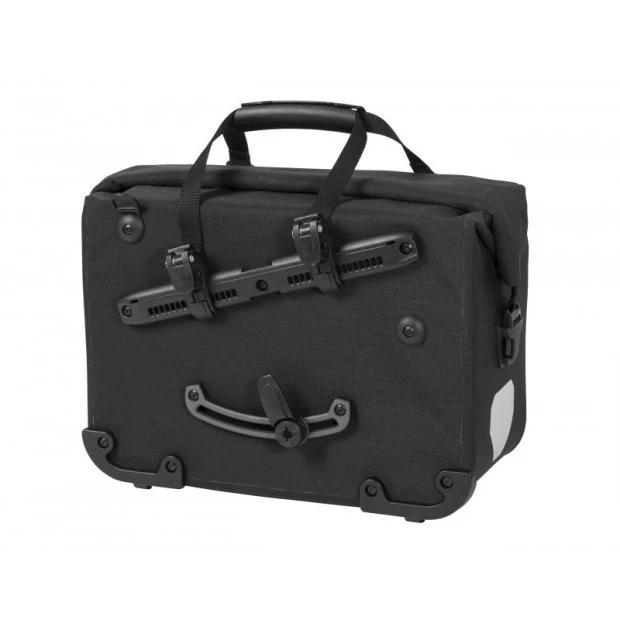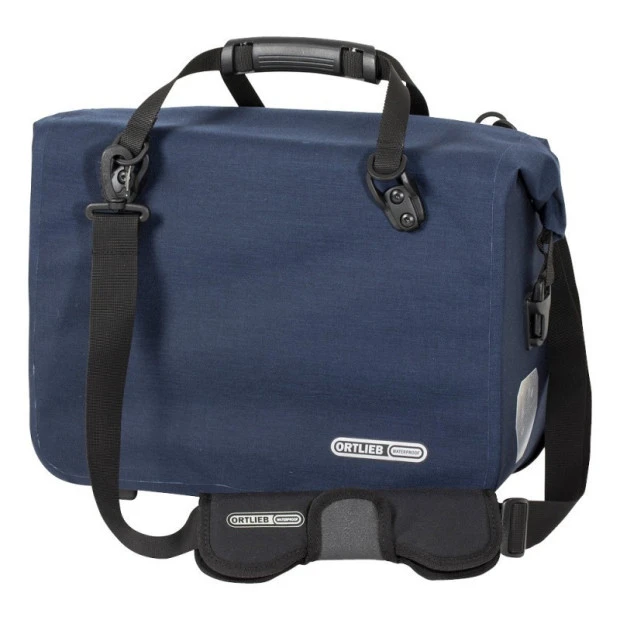 Le porte-documents Ortlieb Office-Bag QL2.1 bleu acier vous accompagnera dans tous vos déplacements professionnels. Ses 21 litres de contenance vous permettront d’emporter avec vous deux grands classeurs DIN A4, des stylos, votre mobile et autres accessoires de bureau. Dans son insert spécial matelassé, vendu séparément, vous pourrez glisser votre ordinateur portable. Son kit de fixation Quick-Lock2.1 (QL2.1) s’adaptent à tous les porte-bagages, dont le diamètre de tube ne dépasse pas 16 mm. Son rail de fixation rotatif permet de le monter à gauche ou à droite sur le porte-bagages. Equipé d’une sangle, il peut se porter en bandoulière. Deux éléments en « matériau 3M Scotchlite » ultra réfléchissant et le logo ORTLIEB réfléchissant (pas pour la variante au coloris argent) sur le devant de la sacoche garantissent d’être vu en cas de mauvaise visibilité ou dans l’obscurité. Un protège-arête au dos de la sacoche et des petits patins fournissent protection et bonne stabilité.