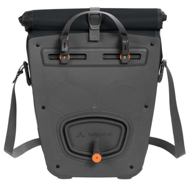 La sacoche de voyage Vaude Aqua Back vous suivra dans tous vos déplacements à vélo quel que soit le temps. Cette sacoche arrière imperméable a été fabriquée en Allemagne avec un matériau de bâche durable, sans PVC. Sa fermeture par roulement permet d’adapter la taille du sac, d’une capacité maximale de 24 litres, au contenant et de garder ce dernier au sec. Une poche intérieure supplémentaire permet de ranger facilement les objets séparément. L’Aqua Back Color se fixe aisément et solidement au porte-bagage arrière grâce au système QMR 2.0. Avec un cadenas de vélo, elle peut être verrouillée directement sur le crochet QMR. Pour votre sécurité, elle est dotée d’éléments réfléchissants.